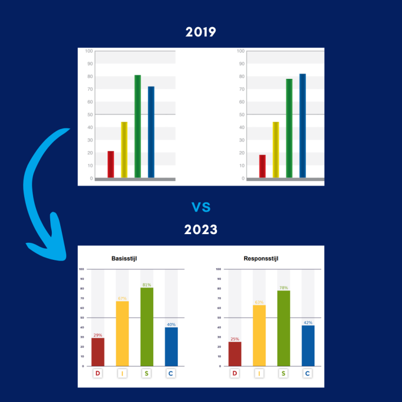 Je ziet aan de DISC analyse in 2023 dat mijn score is veranderd. Mijn ''blauwe gedrag”
